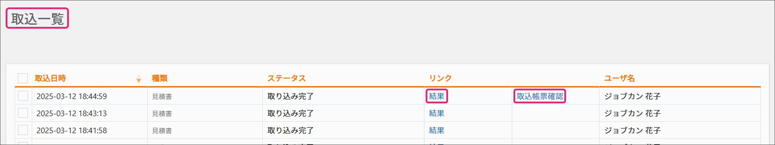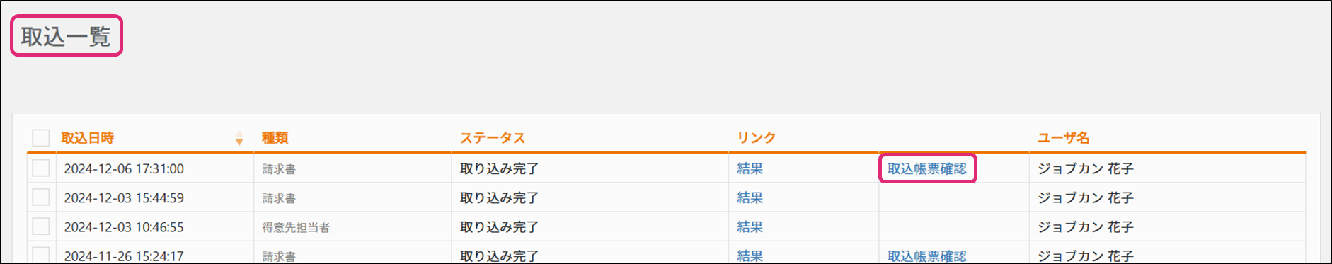 ※取り込み状況はメニュー[データ連携]→[取込一覧]より確認可能です。