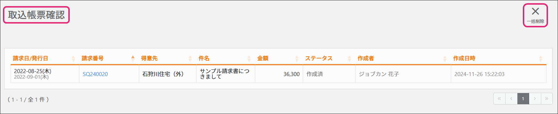 帳票、取込、削除、一括削除、インポート、CSV、一括処理一覧