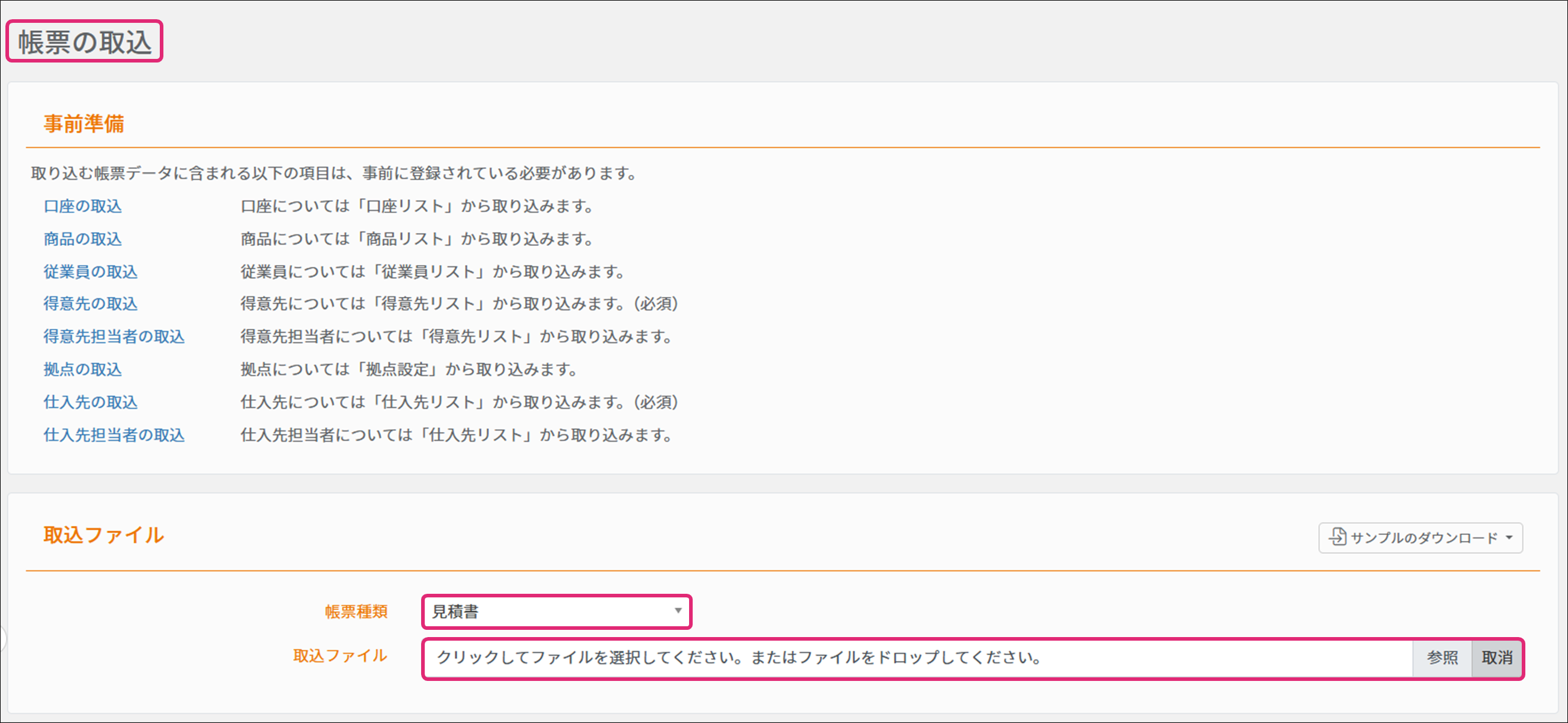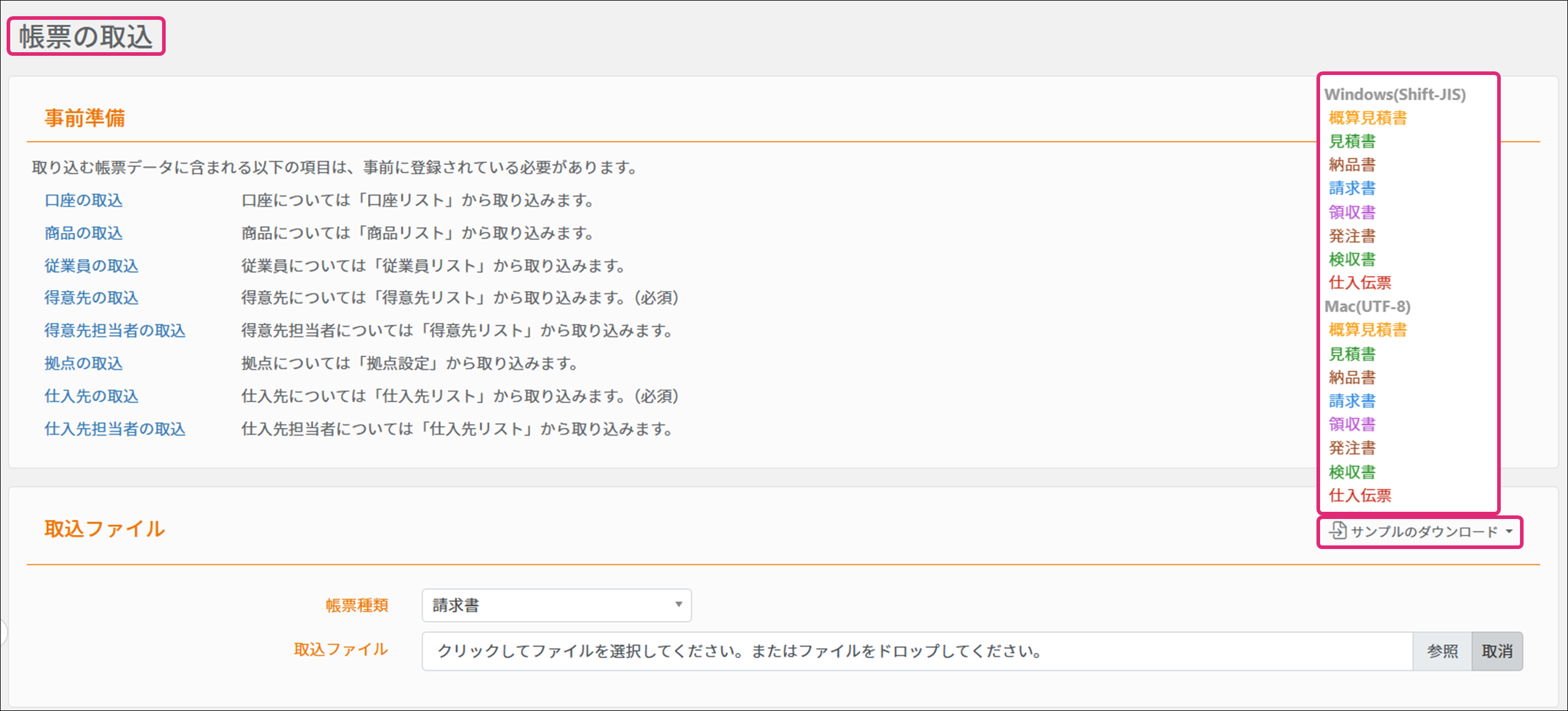2. [帳票の取込]画面が表示されます。[サンプルのダウンロード]をクリックし、使用したい帳票名をクリックすると、サンプルデータがダウンロードされます。