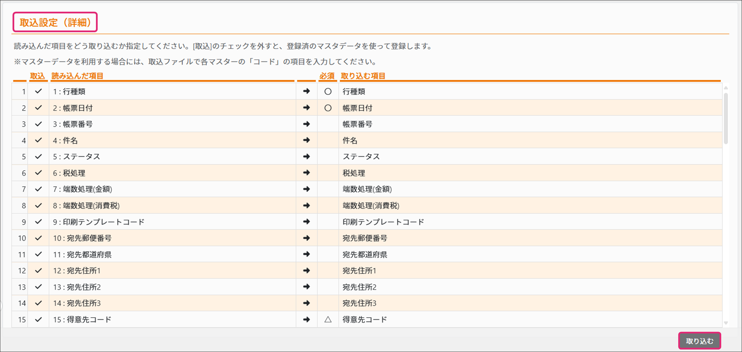 ※「△」が表示されている[得意先コード]と[宛先名1]の項目は、どちらかで取込むことが可能です。