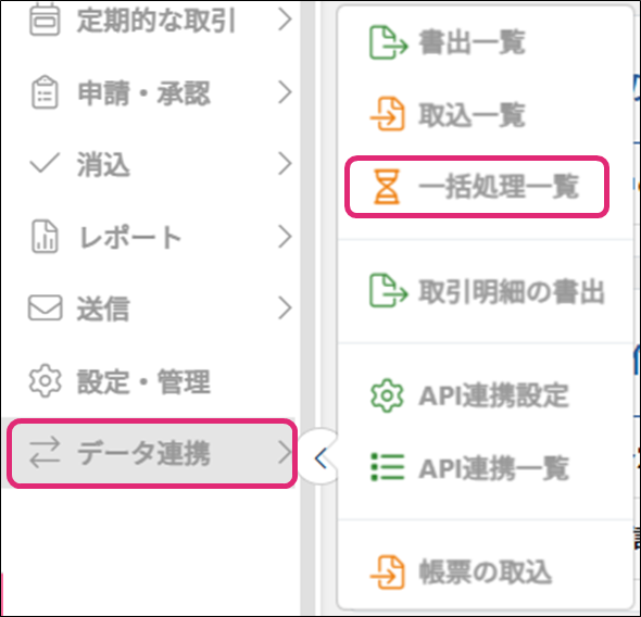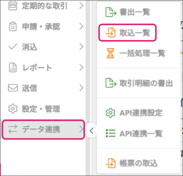 5. メニュー[データ連携]→[取込一覧]をクリックします。