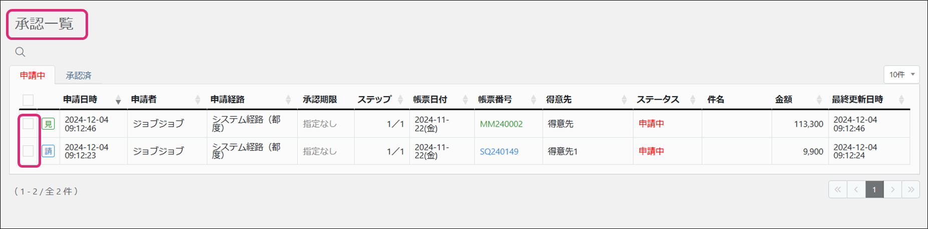 2. [承認一覧]画面が表示されます。表示された一覧から一括で却下したい見積書のチェックボックスにチェックを入れます。