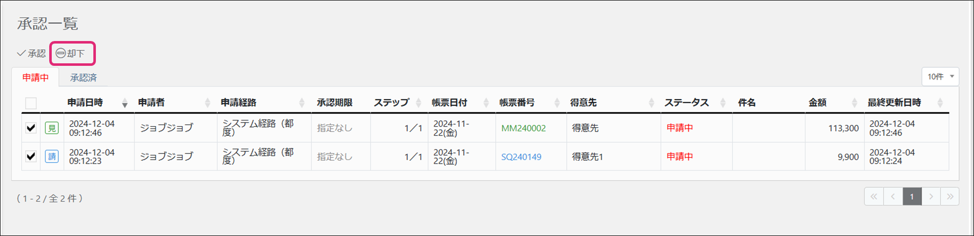 取引、却下、一括却下、帳票、申請