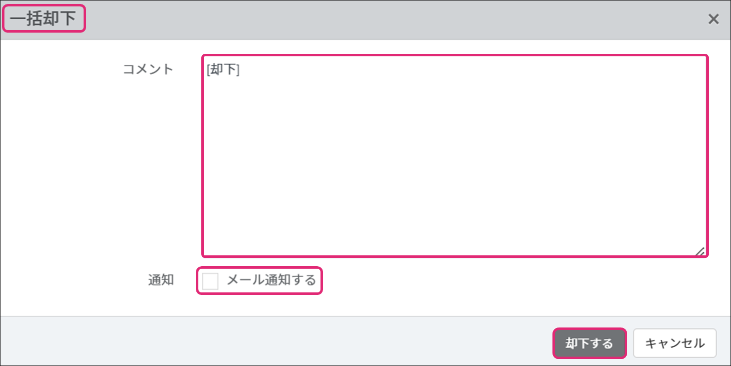 4. [一括却下]ダイアログが表示されます。コメントを入力して必要な操作にチェックを付け、[却下する]をクリックします。