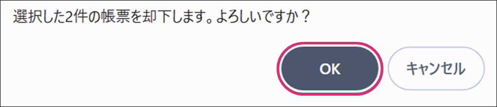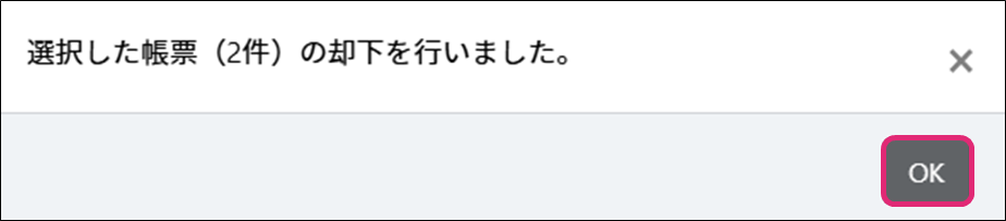 6. 「選択した帳票(○件)を却下しました。」と表示されるので[OK]をクリックしたら、終了です。