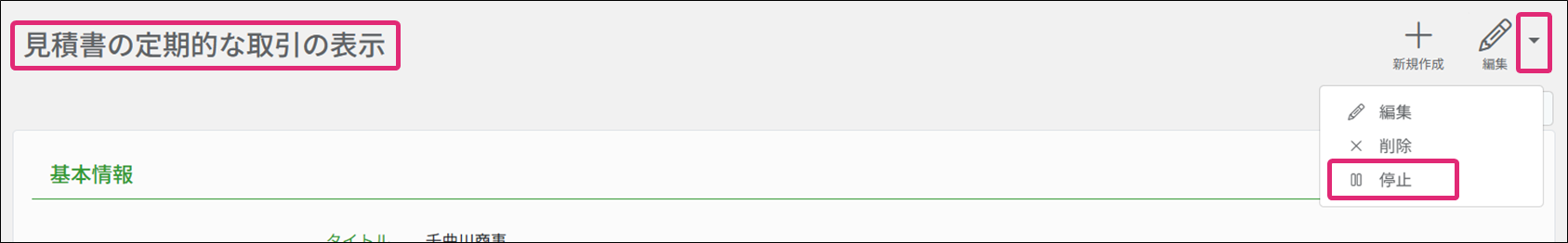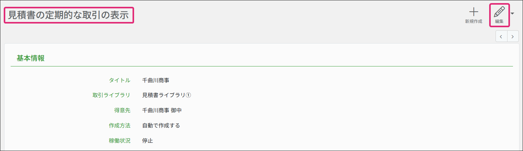 3. [見積書の定期的な取引の表示]画面が表示されます。稼働状況が稼働中の場合は編集できないため、画面右上[編集]横の[▼]→[停止]をクリックします。(稼働状況が停止の場合は手順6に進みます。)