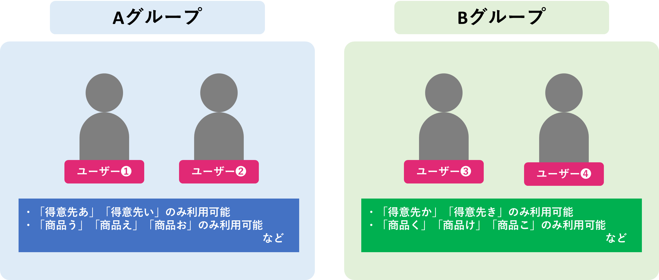 グループ機能では、得意先や商品などのマスター情報の閲覧・利用を、グループごとに制限することが可能です。