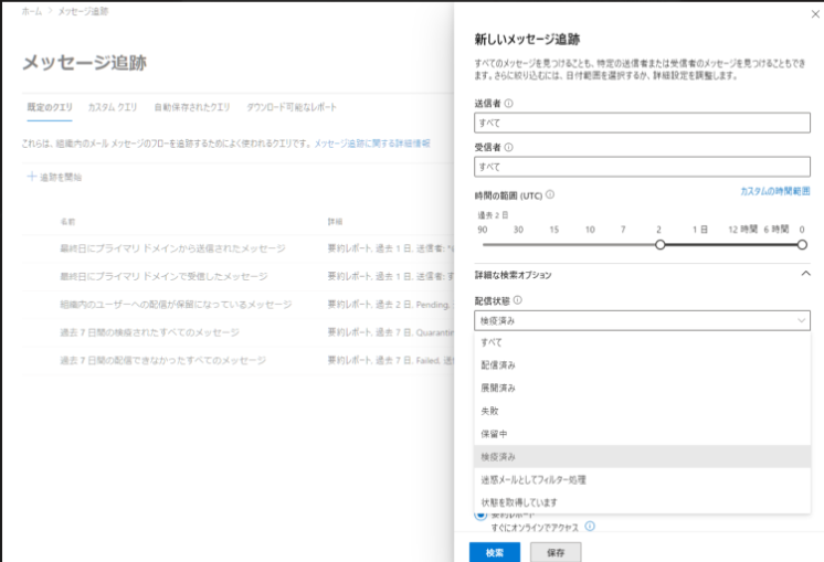 [ 送信元が次のユーザー ] に送信したアドレスを入力し「配信状態」で「検疫済み」を選択すると、ブロックされたメールで絞り込めます。