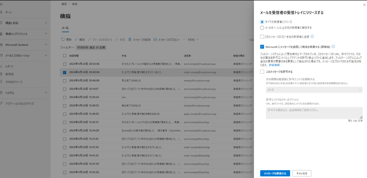⑦検疫が解放され、送信先への受信解放のメールが届きます。