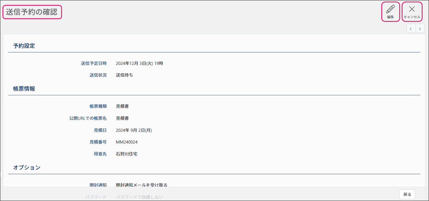 ※送信予約している帳票の中身を編集したい場合は、予約を[キャンセル]する必要があります。