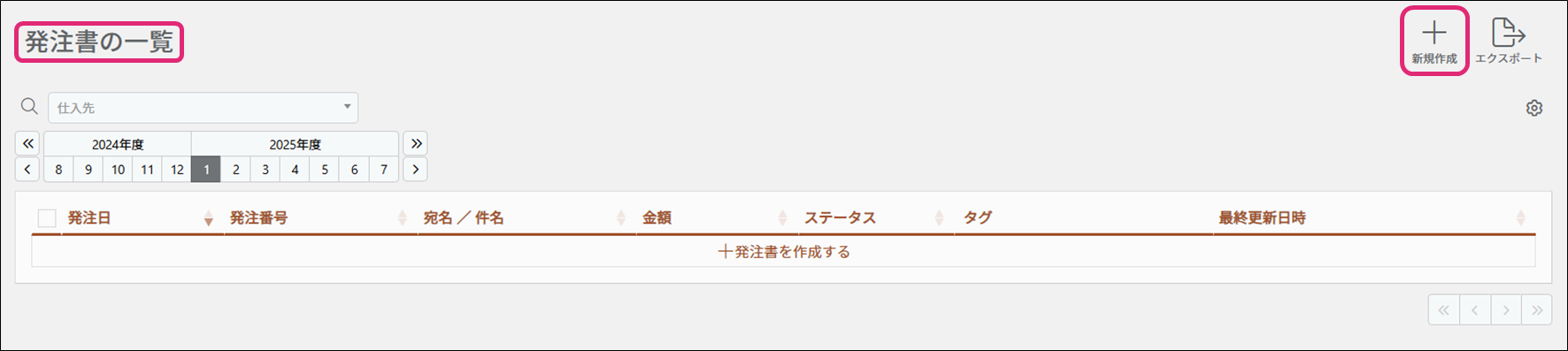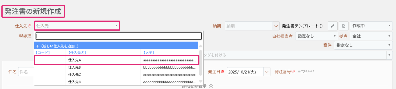 ※[+新しい仕入先を追加]より、帳票作成画面上で追加することも可能です。