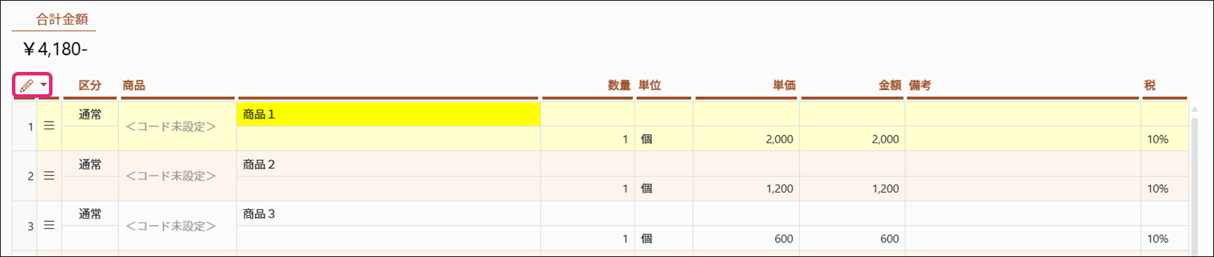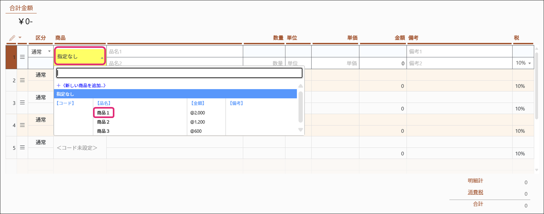 7. 明細入力部で[商品]の入力欄をクリックし、リストから商品を選択します。この時、単価には各商品に登録した[仕入単価]の情報が入力されます。