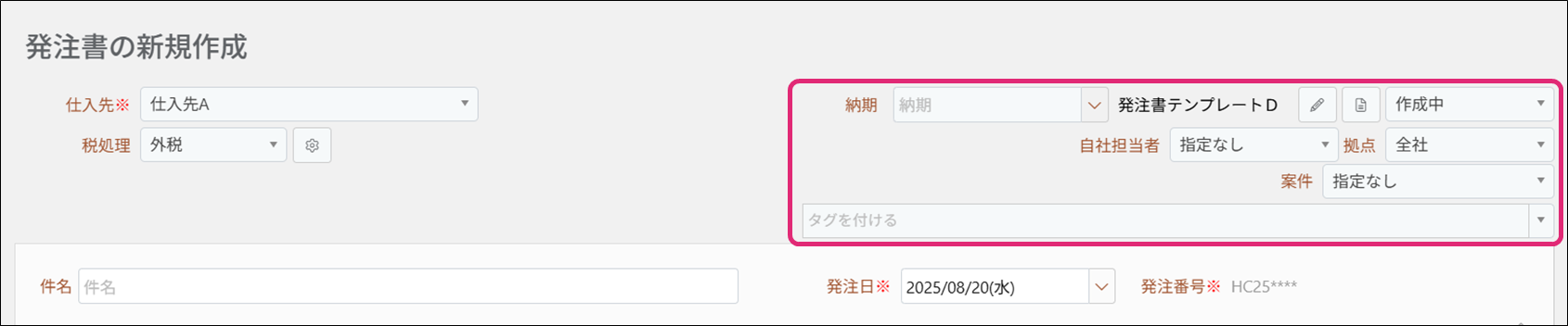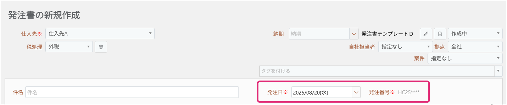 [発注番号]は自動で入力され、「****」部分は保存時に数字に変換されます。一旦保存すると、編集画面で発注番号の変更ができます。