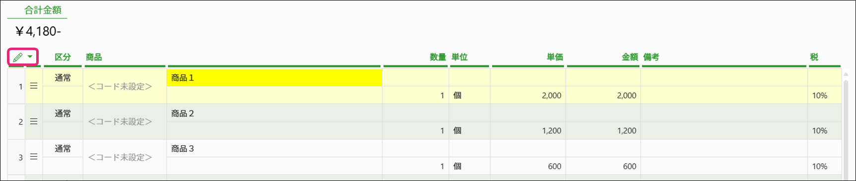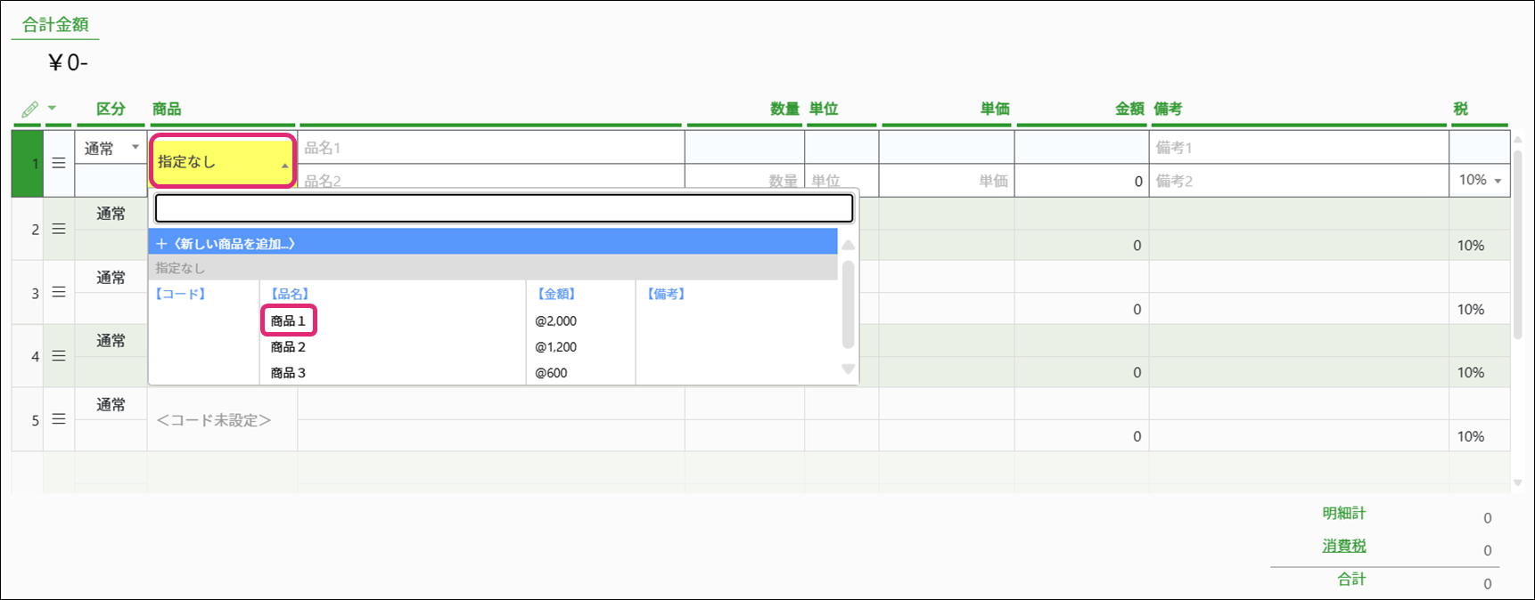 7. 明細入力部で[商品]の入力欄をクリックし、リストから商品を選択します。この時、単価には各商品に登録した[仕入単価]の情報が入力されます。