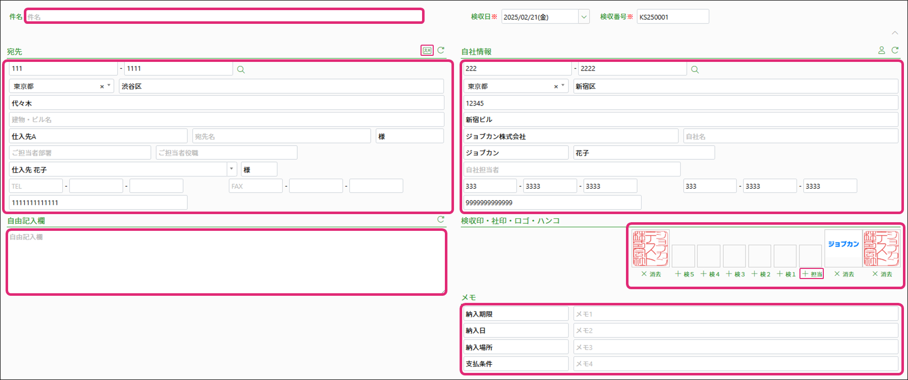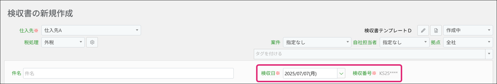 [検収番号]は自動で入力され、「****」部分は保存時に数字に変換されます。一旦保存すると、編集画面で検収番号の変更ができます。
