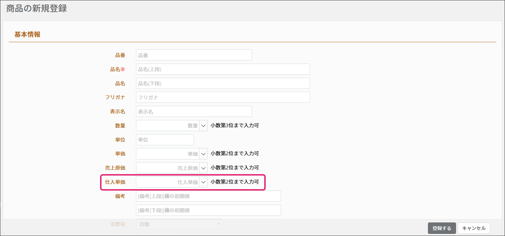 ※リストから商品を選択するには、あらかじめ商品を追加し、仕入単価を登録する必要があります。追加済みの商品に仕入単価を登録したい場合は、商品を編集することも可能です。また、[+新しい商品を追加]より、帳票作成画面上で追加することも可能です。