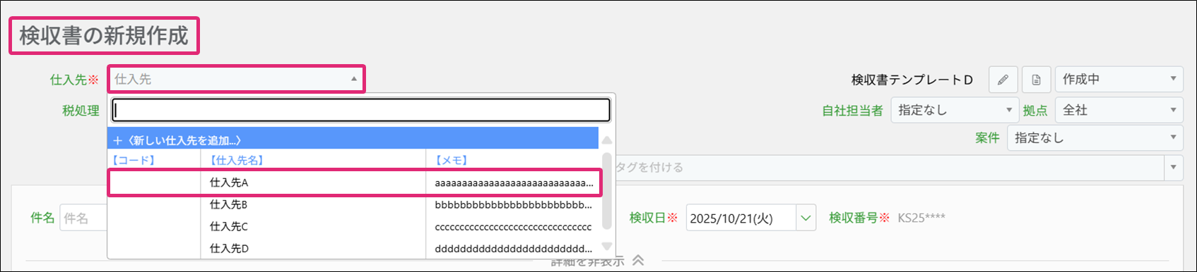 ※[+新しい仕入先を追加]より、帳票作成画面上で追加することも可能です。