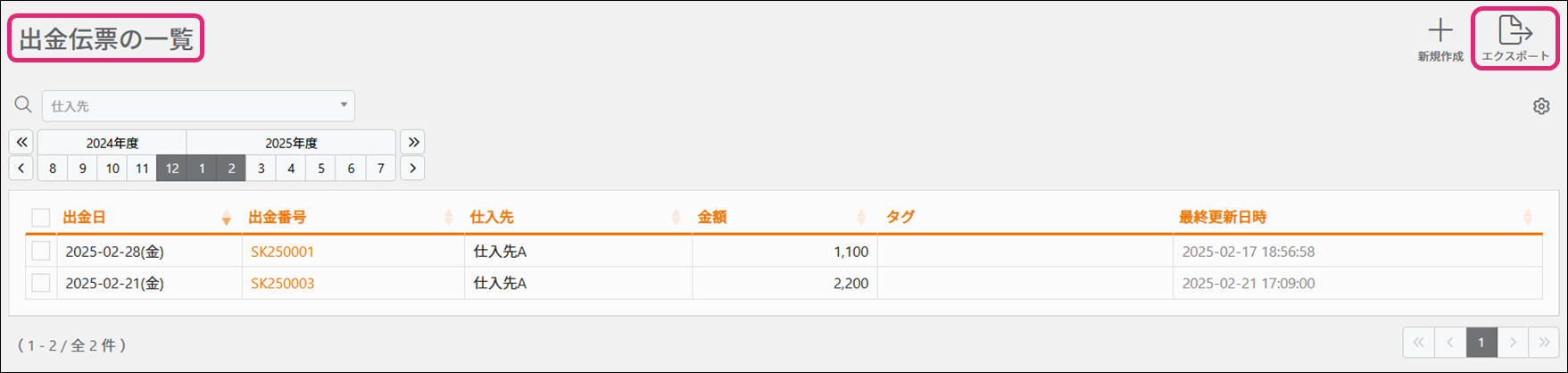 2. [出金伝票の一覧]画面が表示されます。画面右上の[エクスポート]をクリックします。