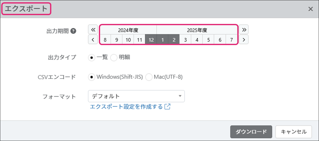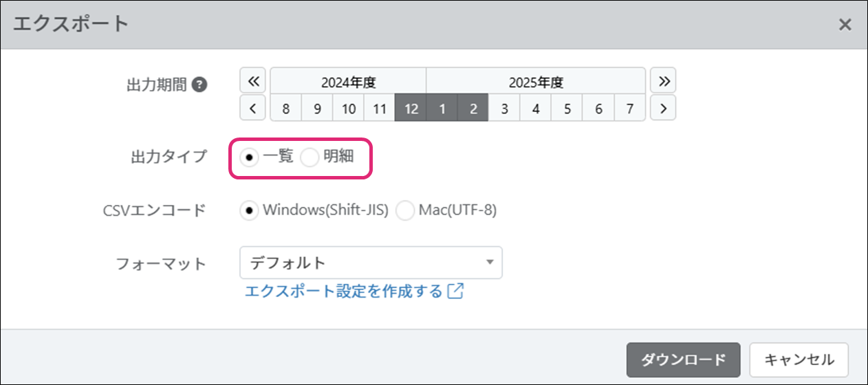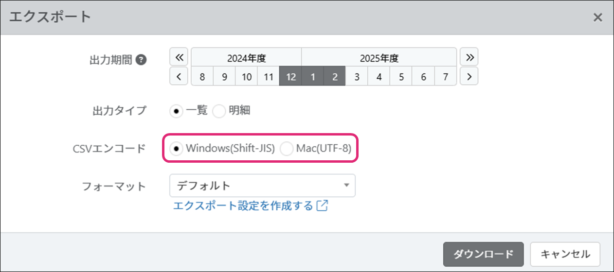 6. エクスポート項目のフォーマットを選択します。初期値は[デフォルト]です。