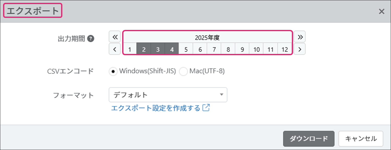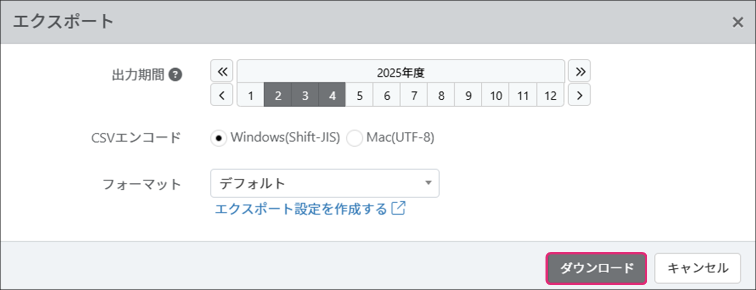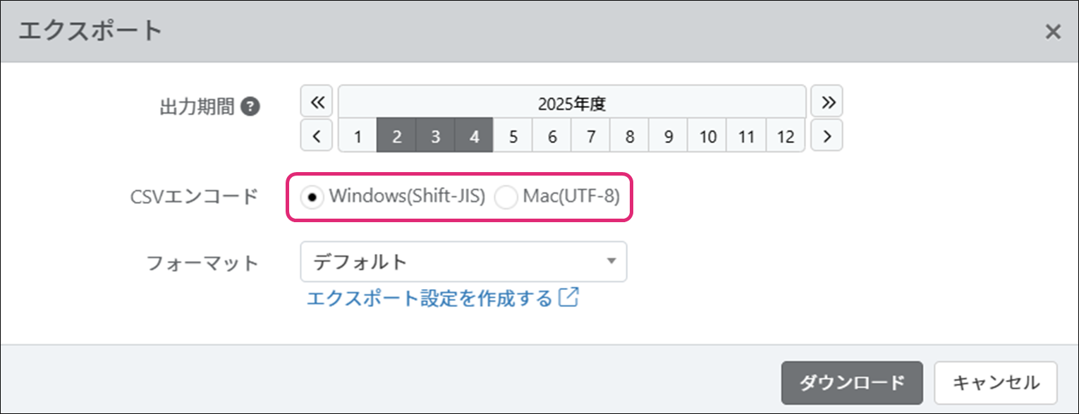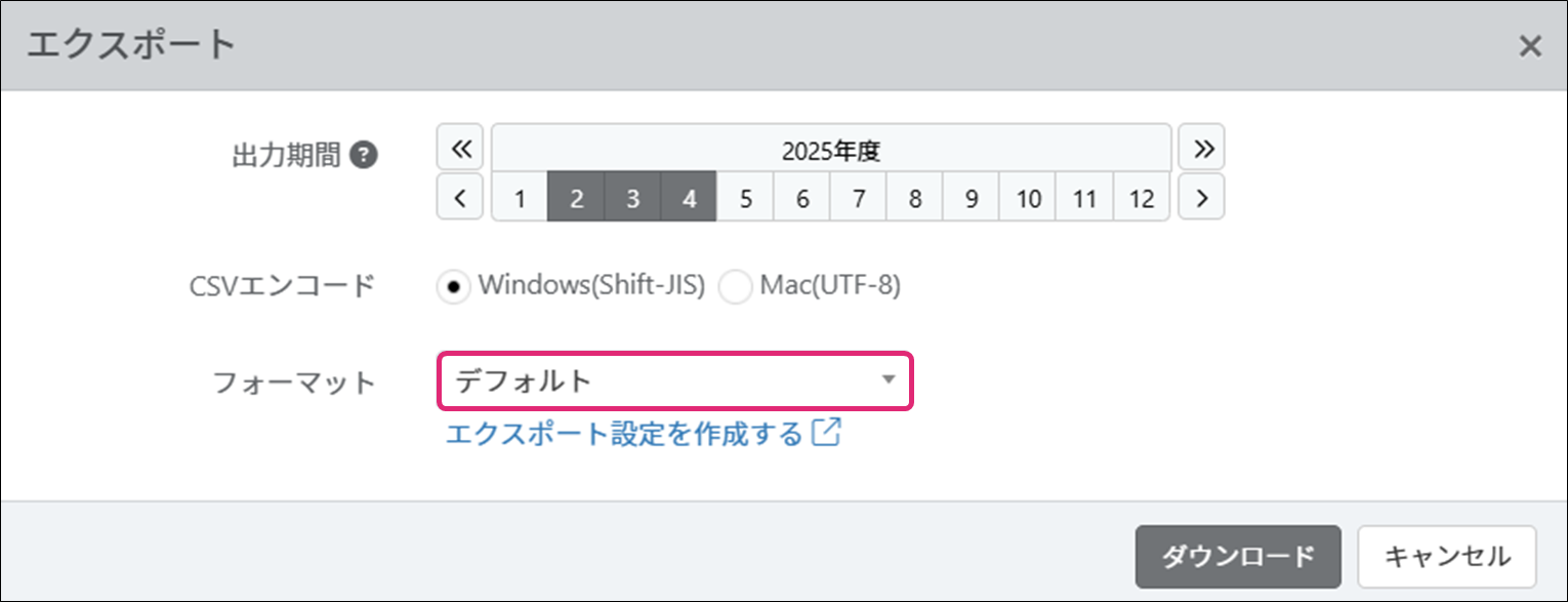 5. エクスポート項目のフォーマットを選択します。初期値は[デフォルト]です。