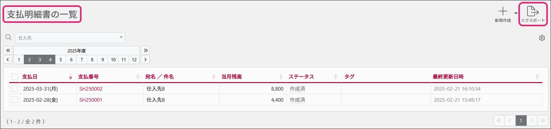2. [支払明細書の一覧]画面が表示されます。画面右上の[エクスポート]をクリックします。