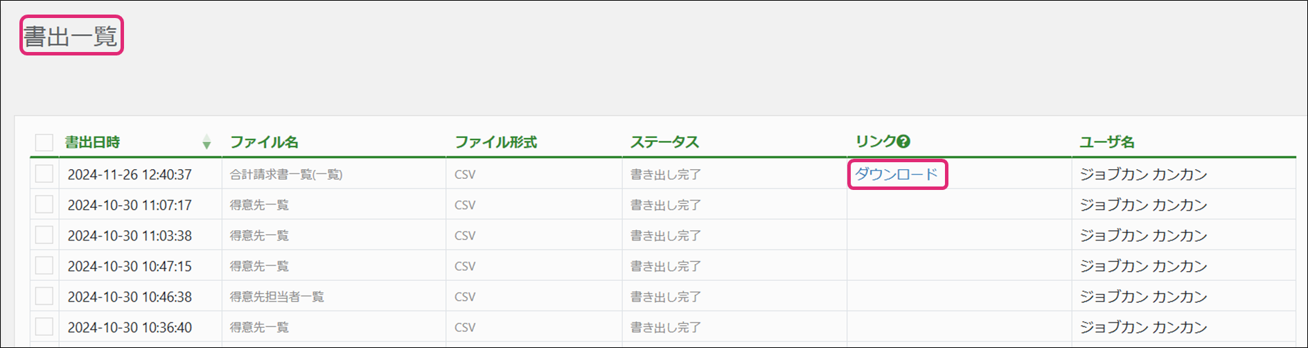 10. [書出一覧]画面が表示されます。該当データの行の[ダウンロード]をクリックします。