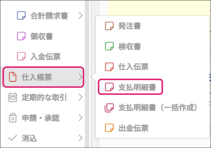 1. メニュー[仕入帳票]→[支払明細書]をクリックします。