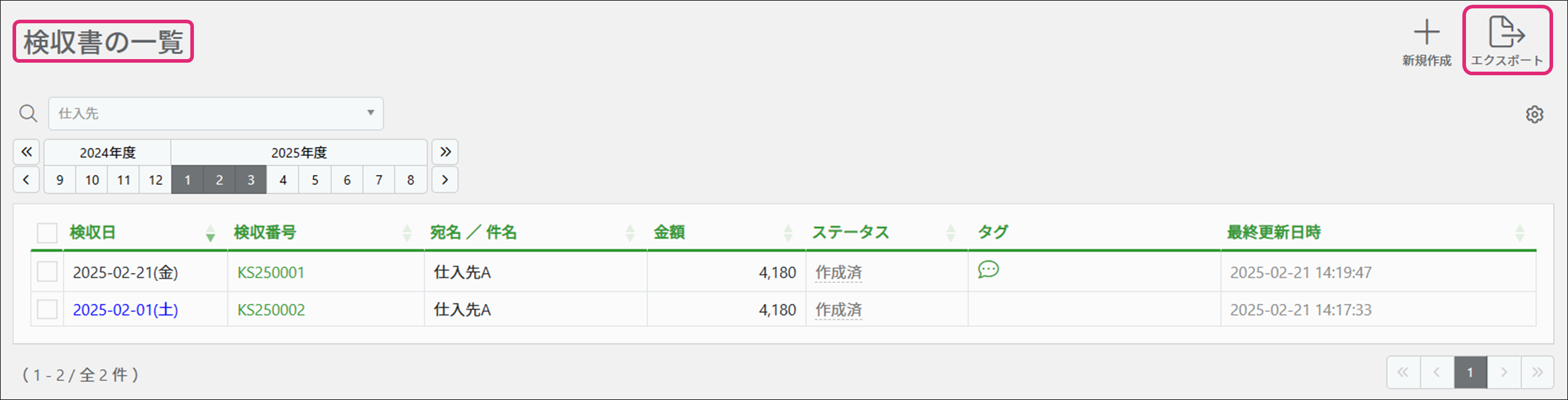 2. [検収書の一覧]画面が表示されます。画面右上の[エクスポート]をクリックします。