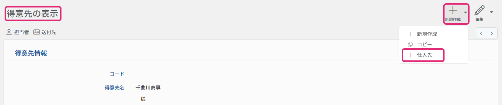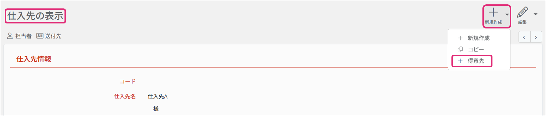 3. [得意先の表示]画面が表示されます。[得意先の表示]画面右上にある[新規作成▼]→[仕入先]をクリックします。