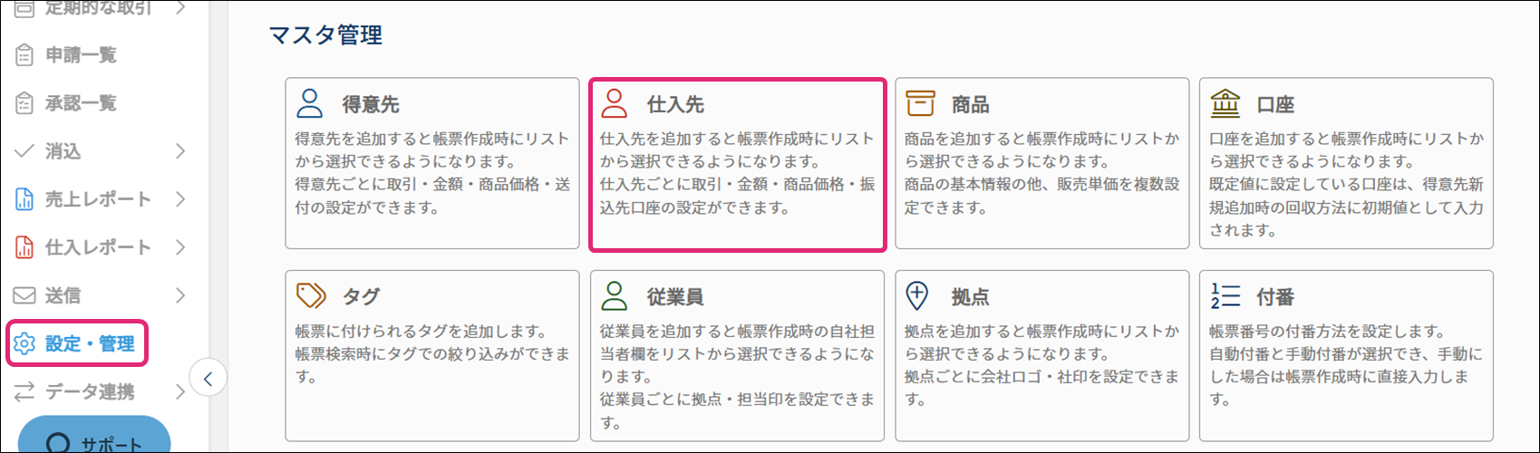 1. メニュー[設定・管理]→[マスタ管理]→[仕入先]をクリックします。