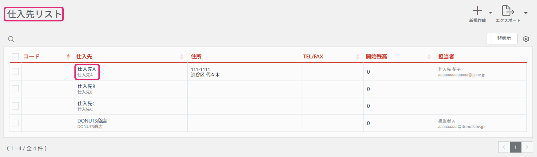 3. [仕入先の表示]画面が表示されます。[仕入先の表示]画面右上にある[新規作成▼]→[得意先]をクリックします。