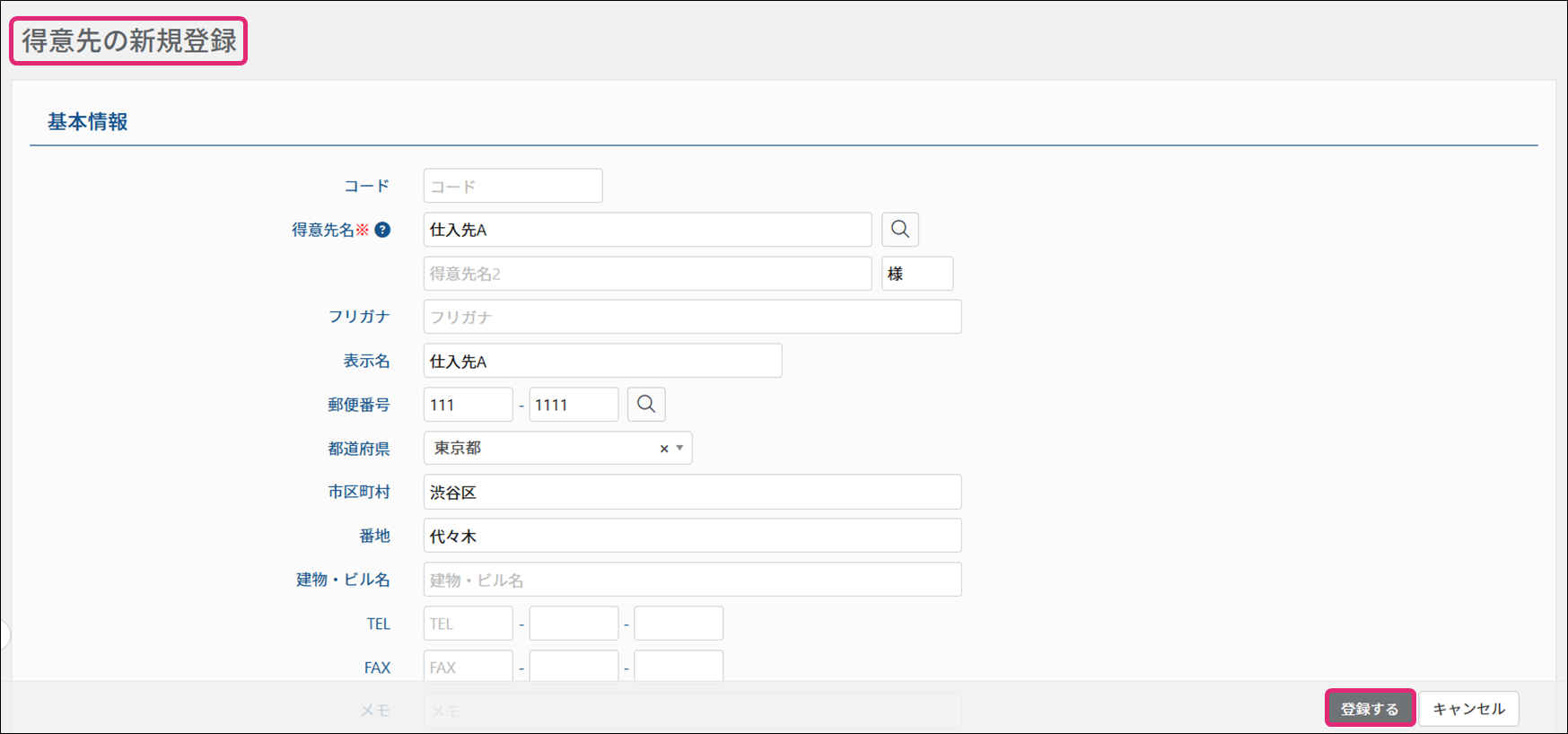 4. [得意先の新規登録]画面が表示されます。必要な情報を入力・修正し、右下の[登録する]をクリックします。