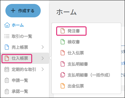 1. メニュー[仕入帳票]→[発注書]をクリックします。