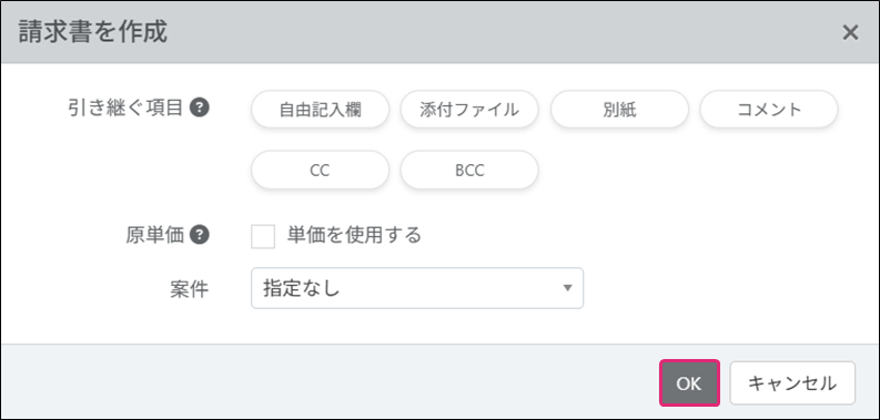 4. [請求書を作成]ダイアログが表示されます。各項目を設定し、[OK]をクリックします。