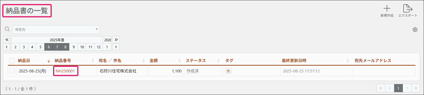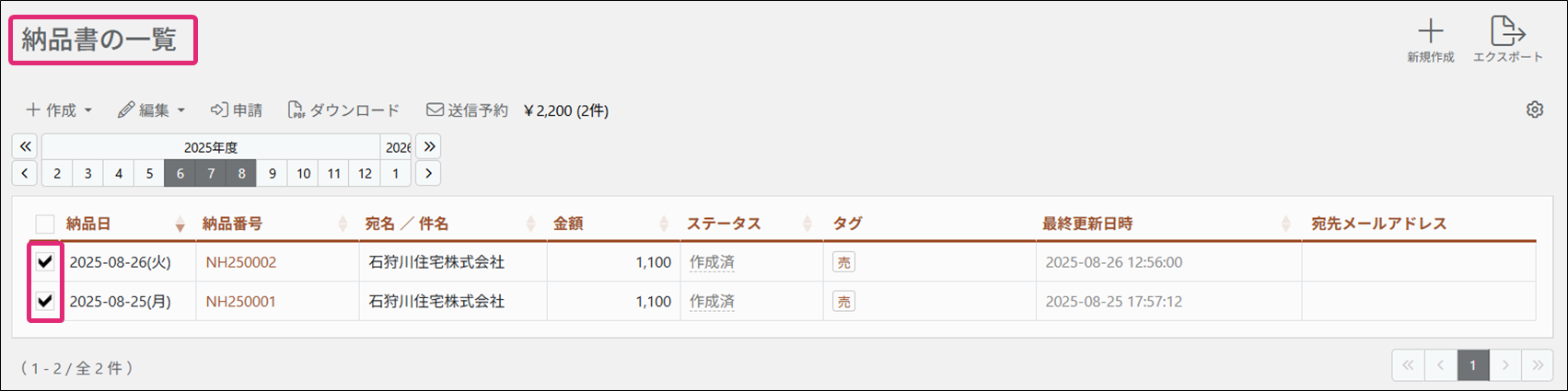2. [納品書の一覧]画面が表示されます。削除したい納品書のチェックボックスにチェックを付けます。