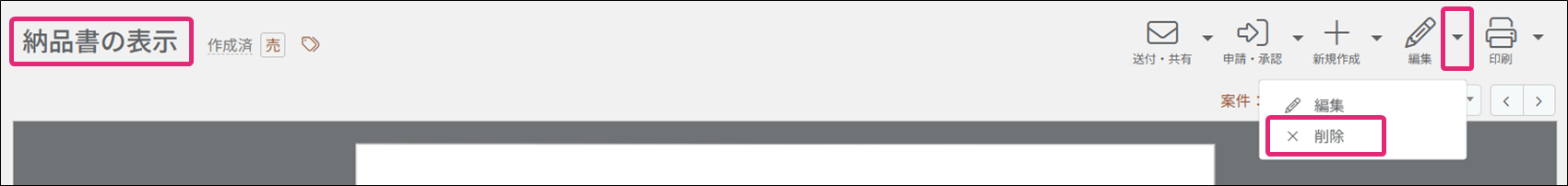 ※プロフェッショナルプラン・トライアルプランの場合、紐づく案件の受注状況が[完了]に設定されている帳票は削除ができません。削除が必要な場合は、紐づく案件の受注状況を変更しておく必要があります。