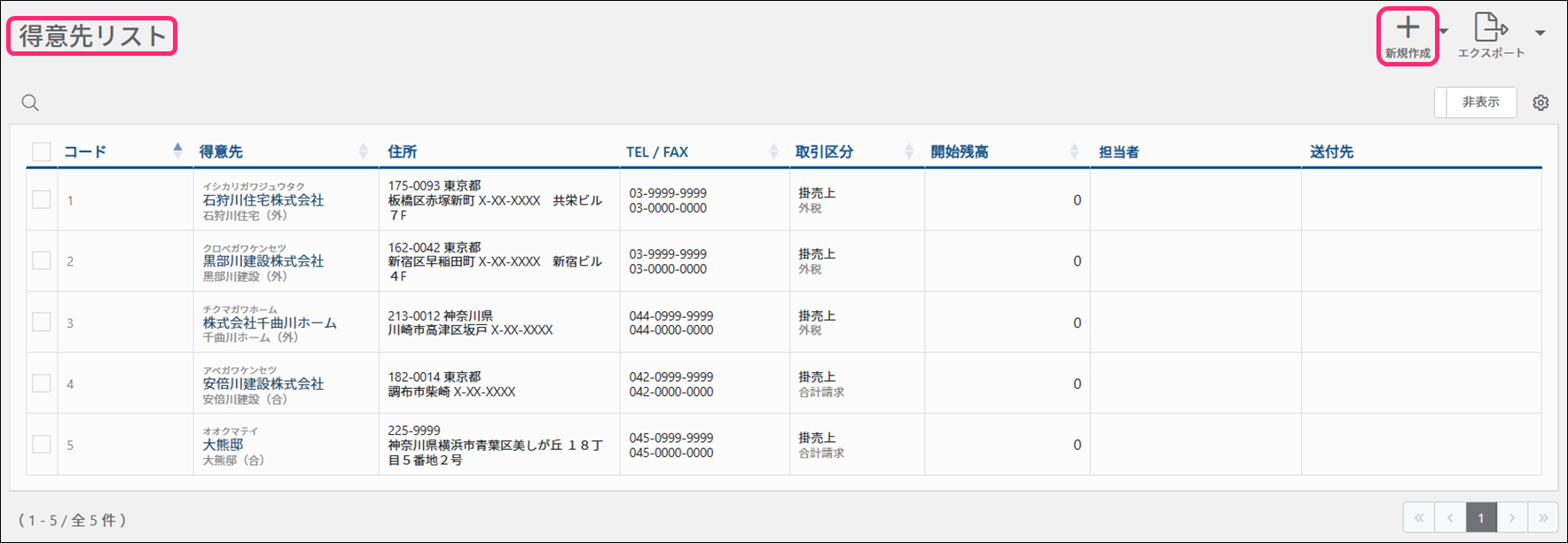 2. [得意先リスト]画面が表示されます。画面右上の[新規作成]をクリックします。