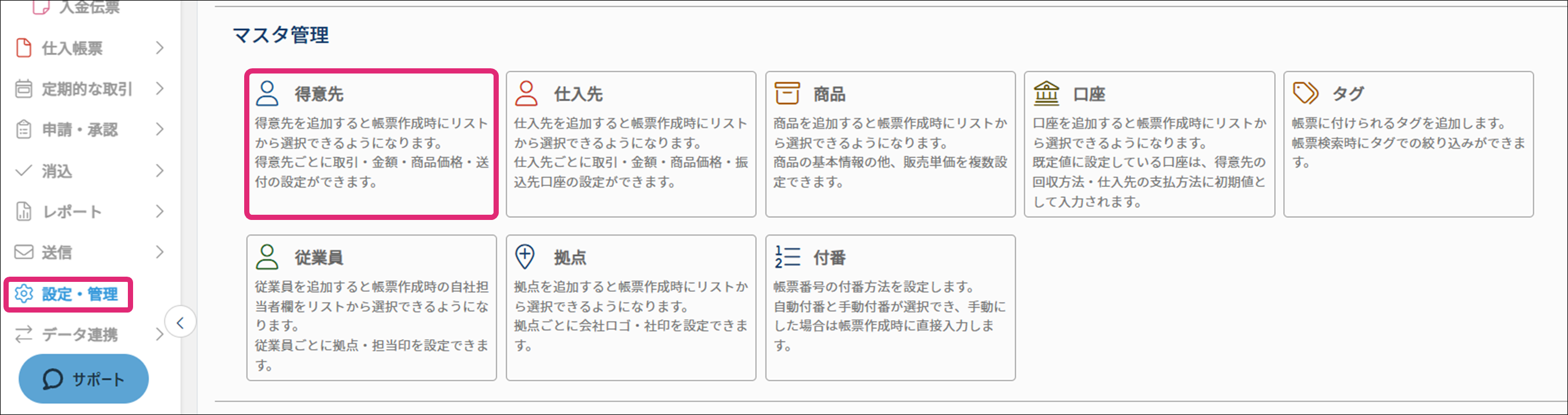 1. メニュー[設定・管理]→[マスタ管理]→[得意先]をクリックします。