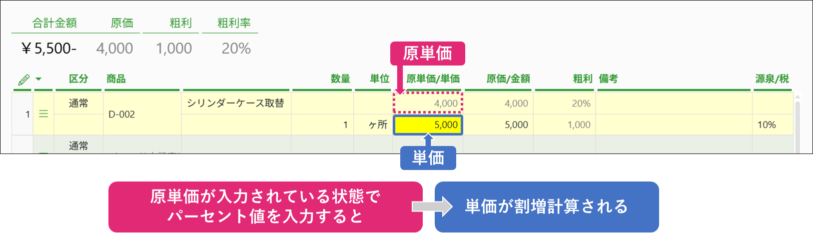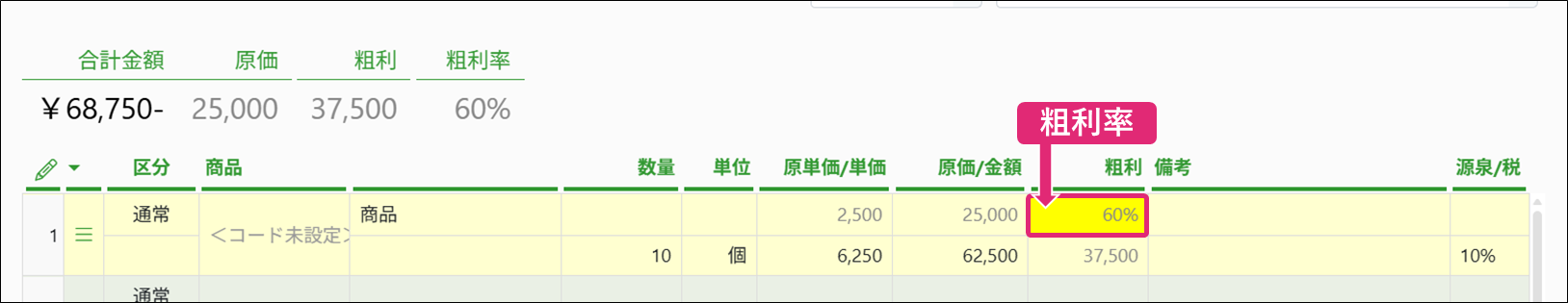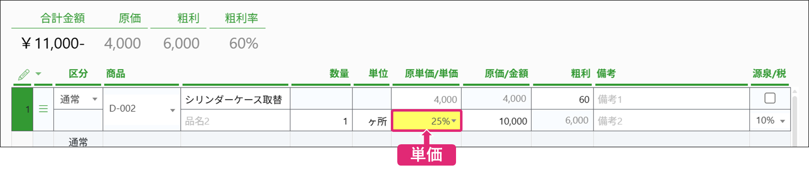 また、数量・原単価・単価を入力することで、原価・粗利・粗利率が自動計算されます。