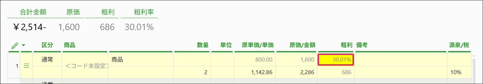 「原価を表示」することで、帳票作成時、「原単価」から原価・粗利・粗利率を自動計算することが可能です。