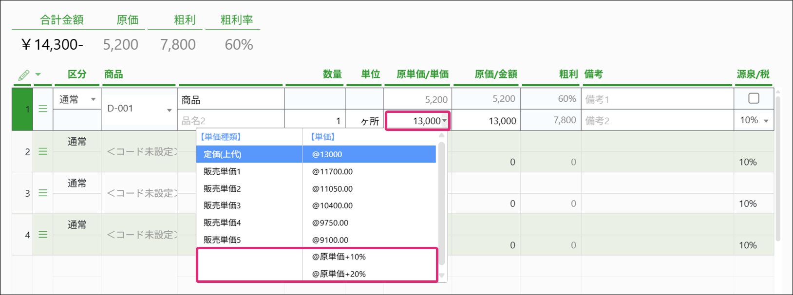 また、単価のセレクターから「@原単価+10%」「@原単価+20%」も利用できます。