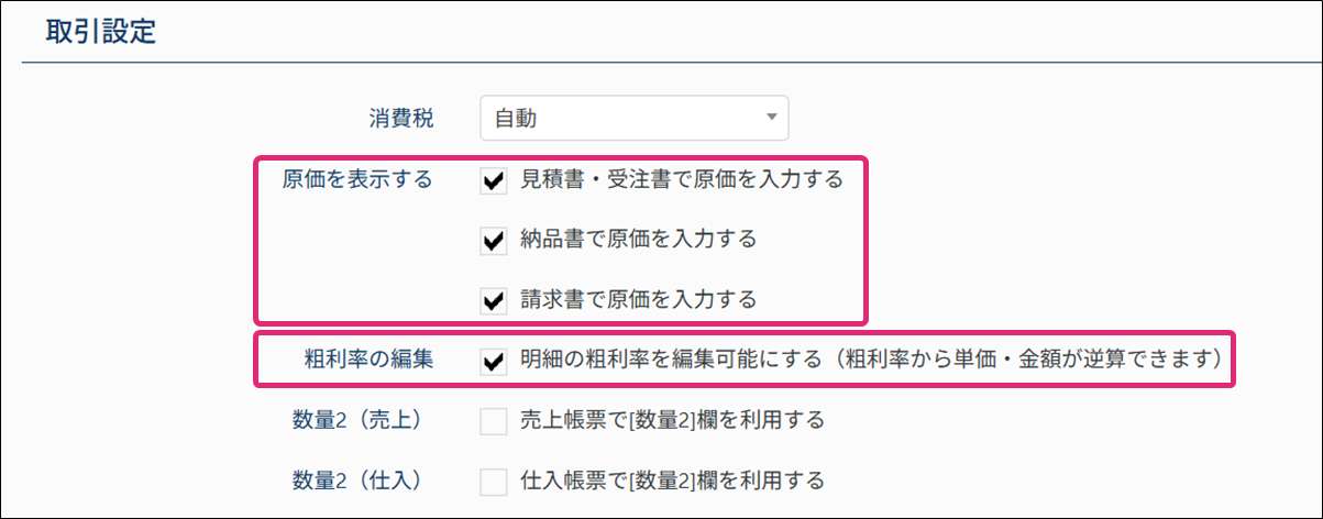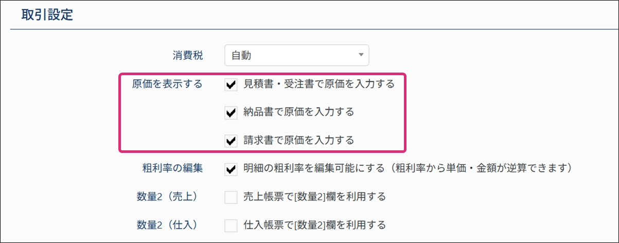 メニュー[設定・管理]→[自社設定]→[取引]画面の、[見積書・受注書で原価を入力する]・[納品書で原価を入力する]・[請求書で原価を入力する]にチェックを入れます。