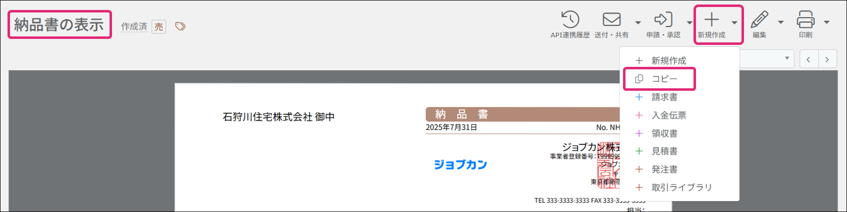 3. [納品書の表示]画面が表示されます。画面右上の[+新規作成]→[コピー]をクリックします。