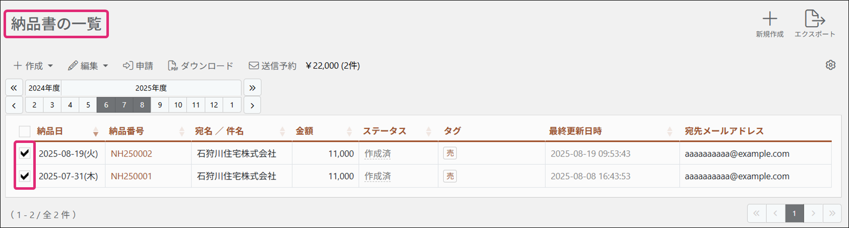 2. [納品書の一覧]画面が表示されます。流用元になる納品書のチェックボックスにチェックを付けます。