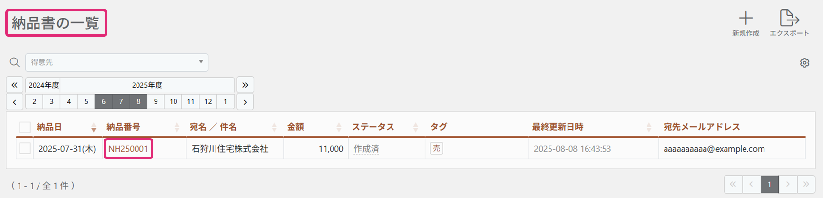 2. [納品書の一覧]画面が表示されます。流用元になる納品書の「納品番号」をクリックします。