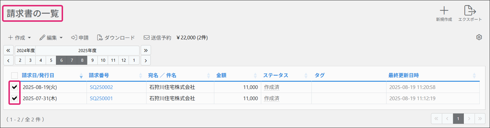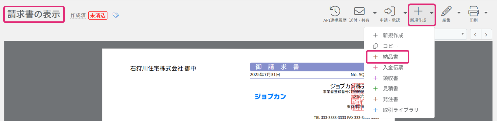 ※請求書から納品書を作成した場合は、自動的にステータスが「納品済」に更新されます。