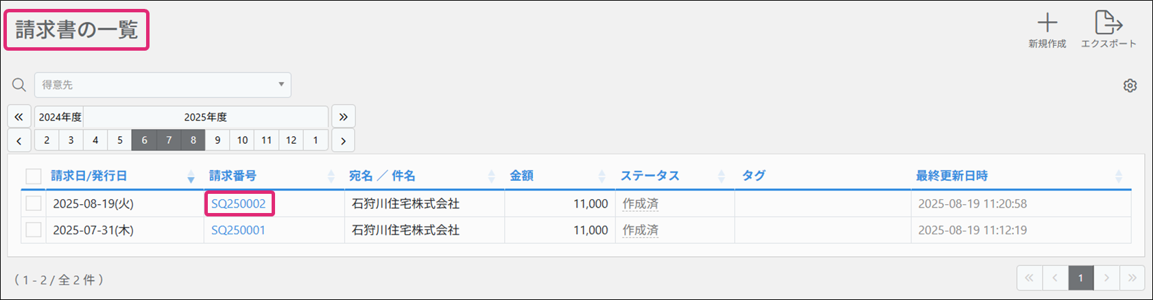 2. [請求書の一覧]画面が表示されます。流用元になる請求書の「請求番号」をクリックします。