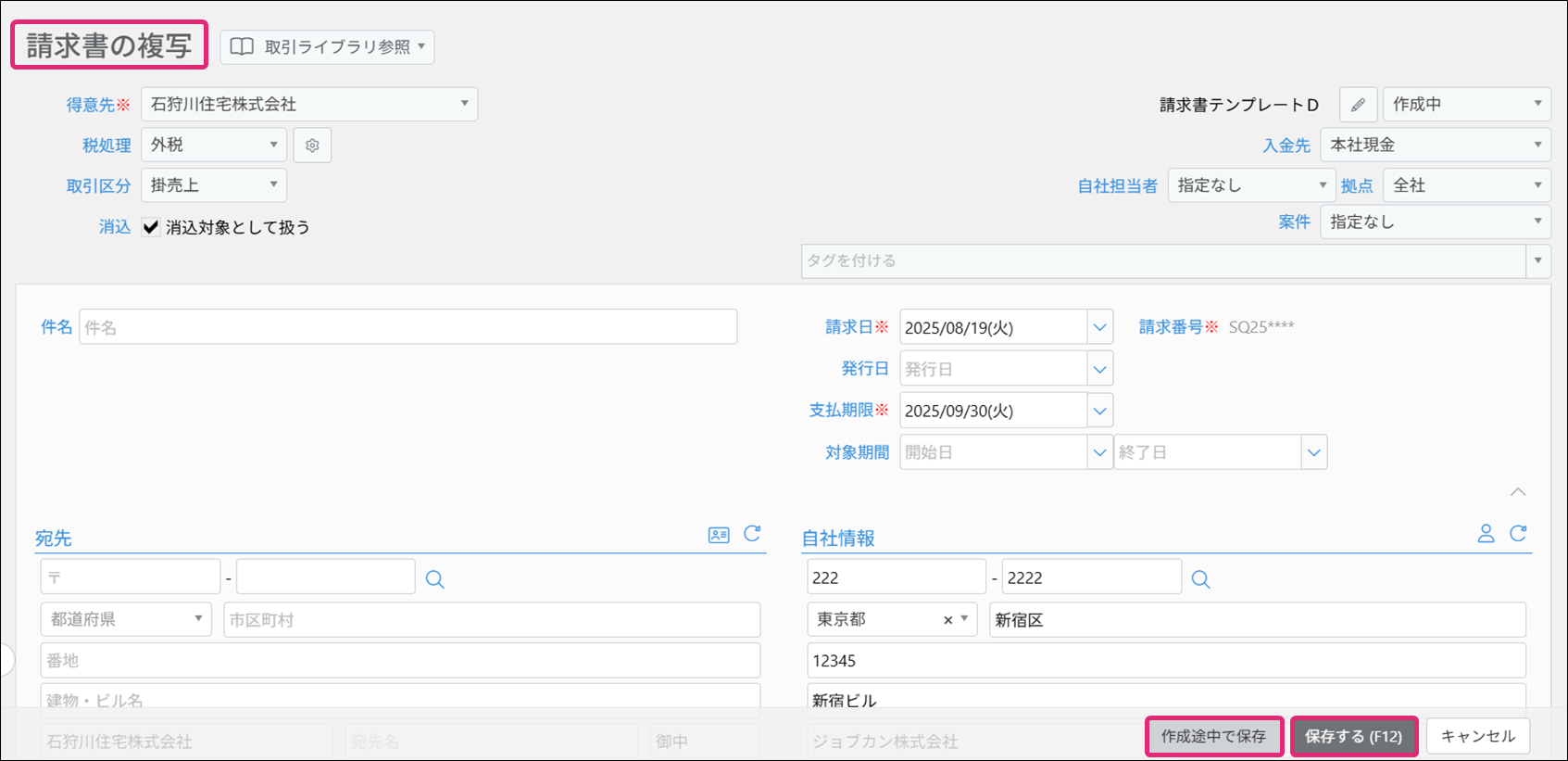 5. [請求書の複写]画面が表示されます。必要に応じて修正を行い、[保存する]または[作成途中で保存]をクリックします。