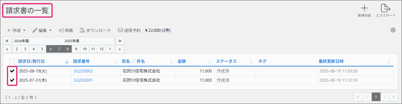 2. [請求書の一覧]画面が表示されます。流用元になる請求書のチェックボックスにチェックを付けます。