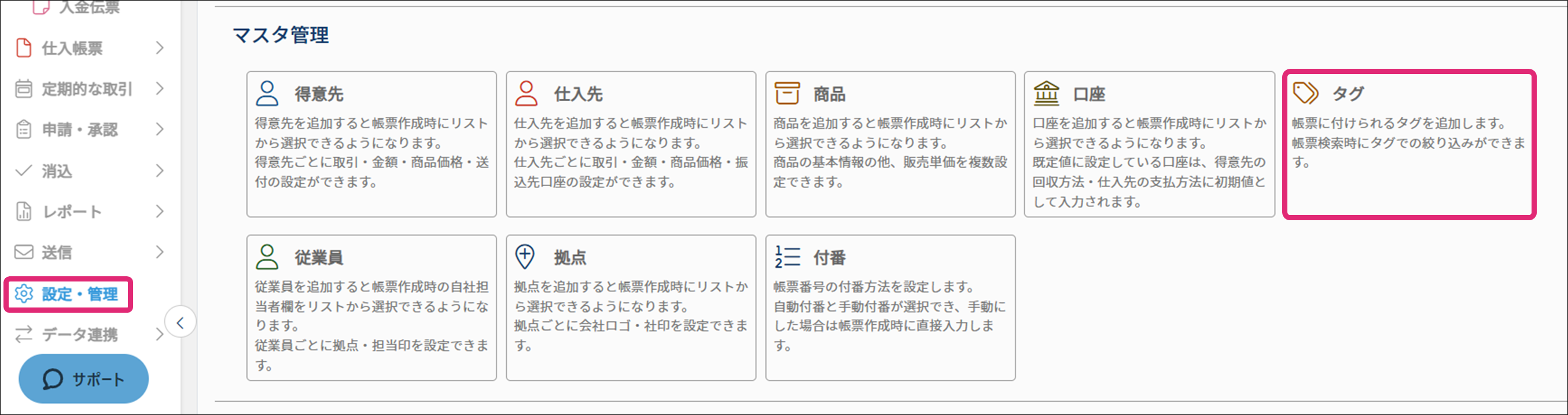 1. メニュー[設定・管理]→[マスタ管理]→[タグ]をクリックします。